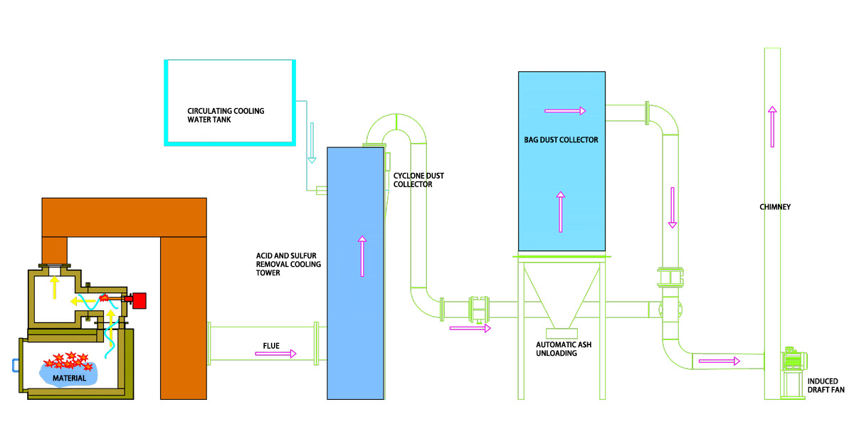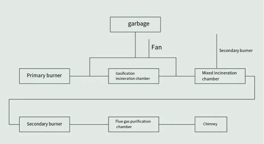 กระบวนการเผาไหม้: ของเสียเข้าสู่ห้องเผาไหม้เพื่อการเผาไหม้ ข้างในมีการตั้งค่าโซนการเผาไหม้และส่วนเล็ก ๆ ของห้องเผาไหม้จะทุ่มเทให้กับกระบวนการเผาไหม้ ที่นี่ของเสียจะสัมผัสกับอากาศอุ่นติดไฟด้วยเครื่องเผาไหม้ที่ควบคุมอุณหภูมิ การยึดมั่นในหลักการของอุณหภูมิเวลาและความปั่นป่วนทั้งสาม T ของเสียจะผ่านการออกซิเดชั่นไพโรไลซิสและการเผาไหม้ภายในร่างกายเตาเผา ก๊าซไอเสียที่เกิดขึ้นนั้นจะเข้าสู่ห้องเผาไหม้ที่สองซึ่งมันผ่านการเผาไหม้อุณหภูมิสูง ก๊าซไอเสียอยู่ภายใต้อุณหภูมิเกิน 850 ° C เป็นเวลาอย่างน้อย 2 วินาทีเพื่อให้มั่นใจว่าการเผาก๊าซที่เป็นอันตรายอย่างสมบูรณ์และการสลายตัวของเชื้อโรคที่เป็นอันตราย สารอินทรีย์ในการเผาไหม้ของเสียสร้างความร้อนและปล่อยก๊าซคาร์บอนไดออกไซด์และไอน้ำ